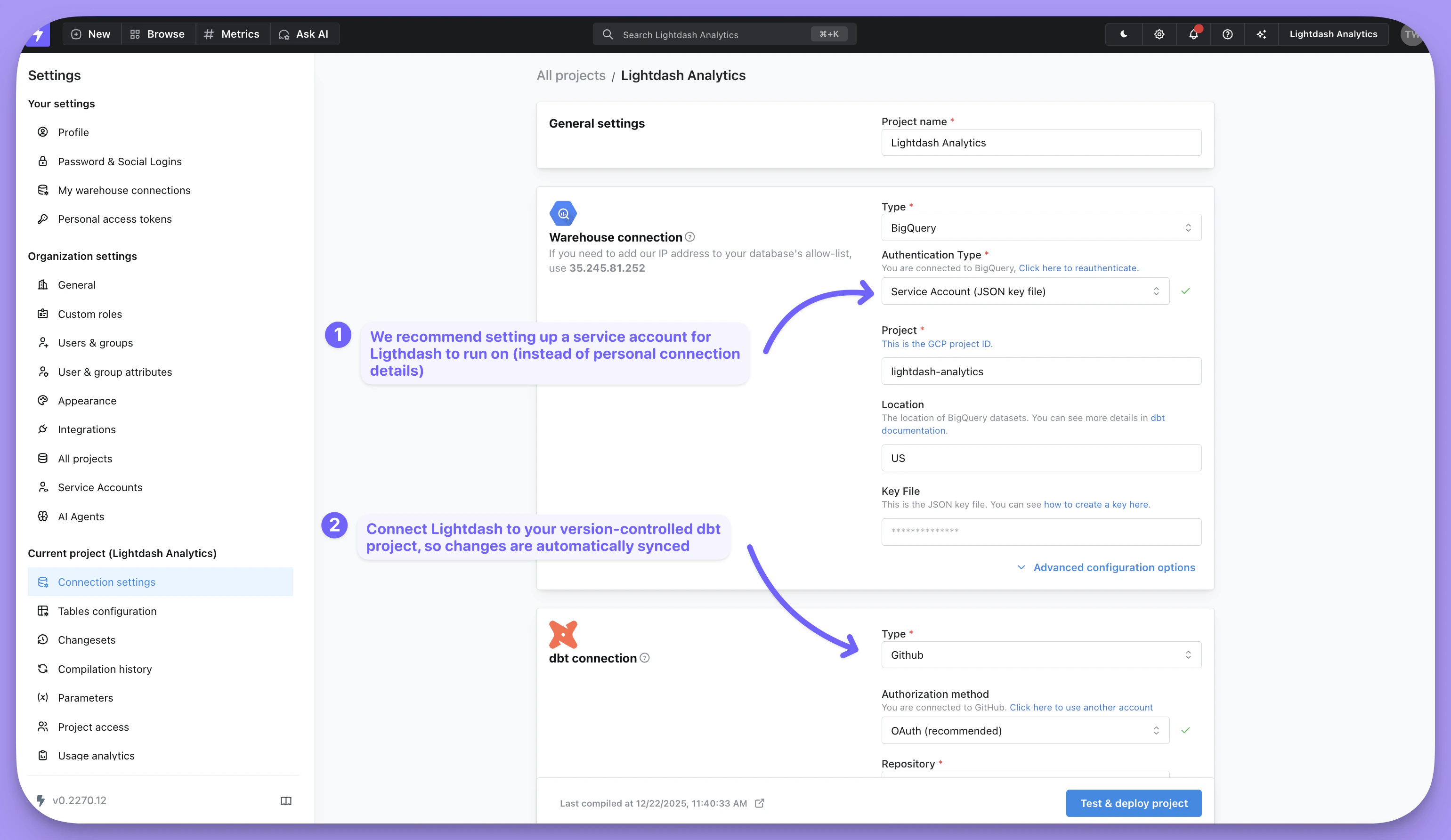 2. Connect Lightdash to your version controlled dbt project so changes are automatically synced.