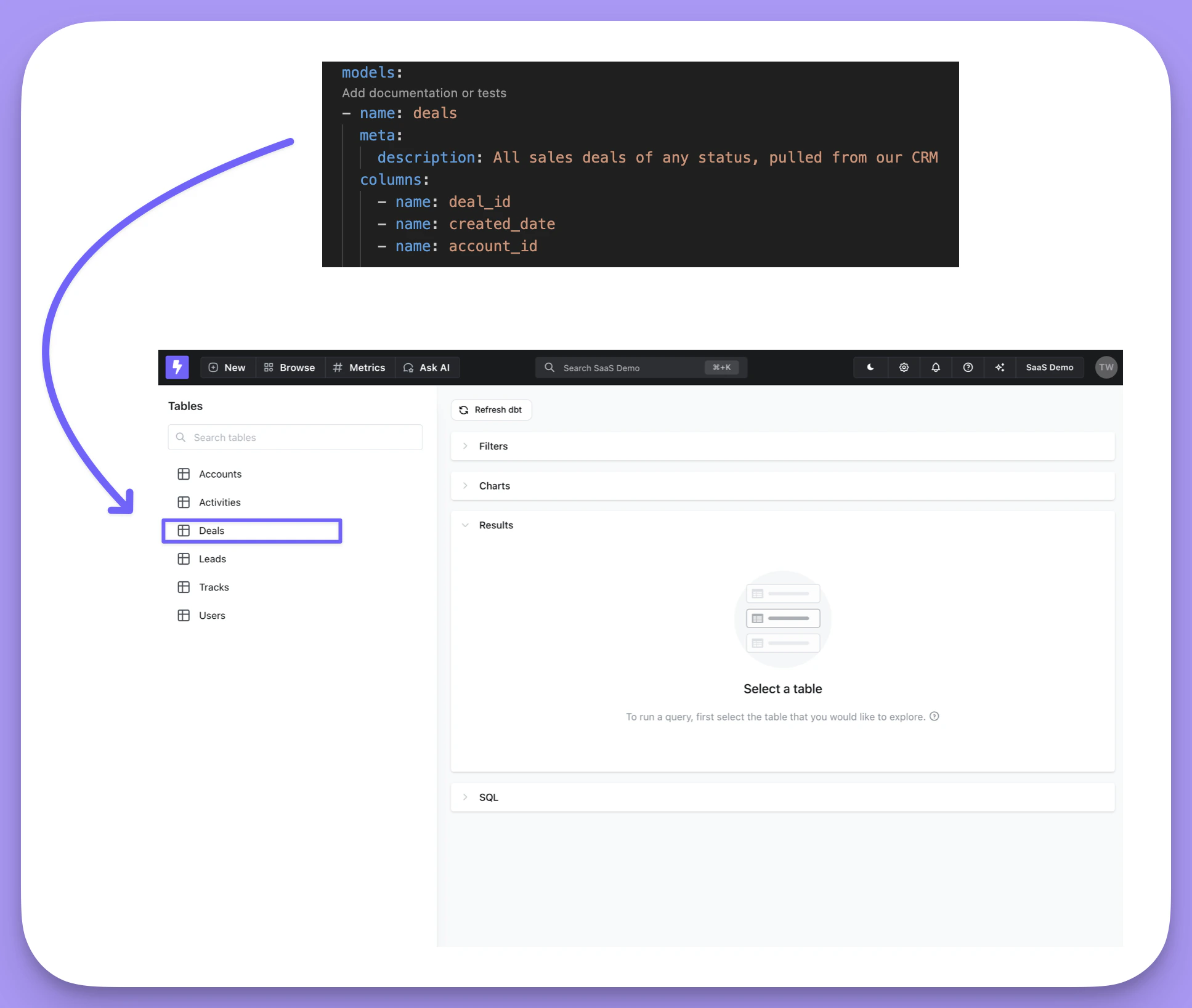 Here’s an example of our deals model we’ve defined in dbt. In Lightdash, we can see it in our list of available Tables to explore.
