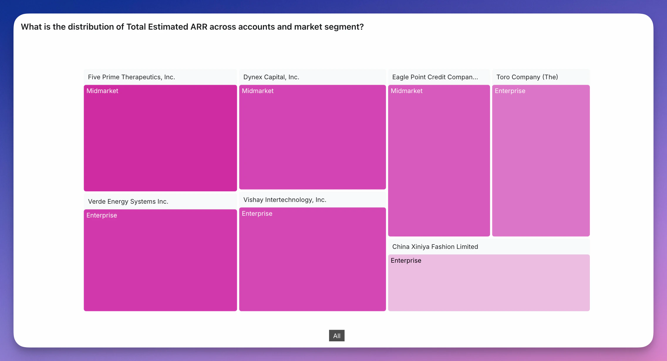 Treemaps show parts of a whole using nested rectangles. Each rectangle’s size represents the value of a metric, and dimensions define how the data is grouped and nested. You can use a single dimension or multiple and they will work as described below. One dimension: Each category becomes a rectangle, sized by the metric value.