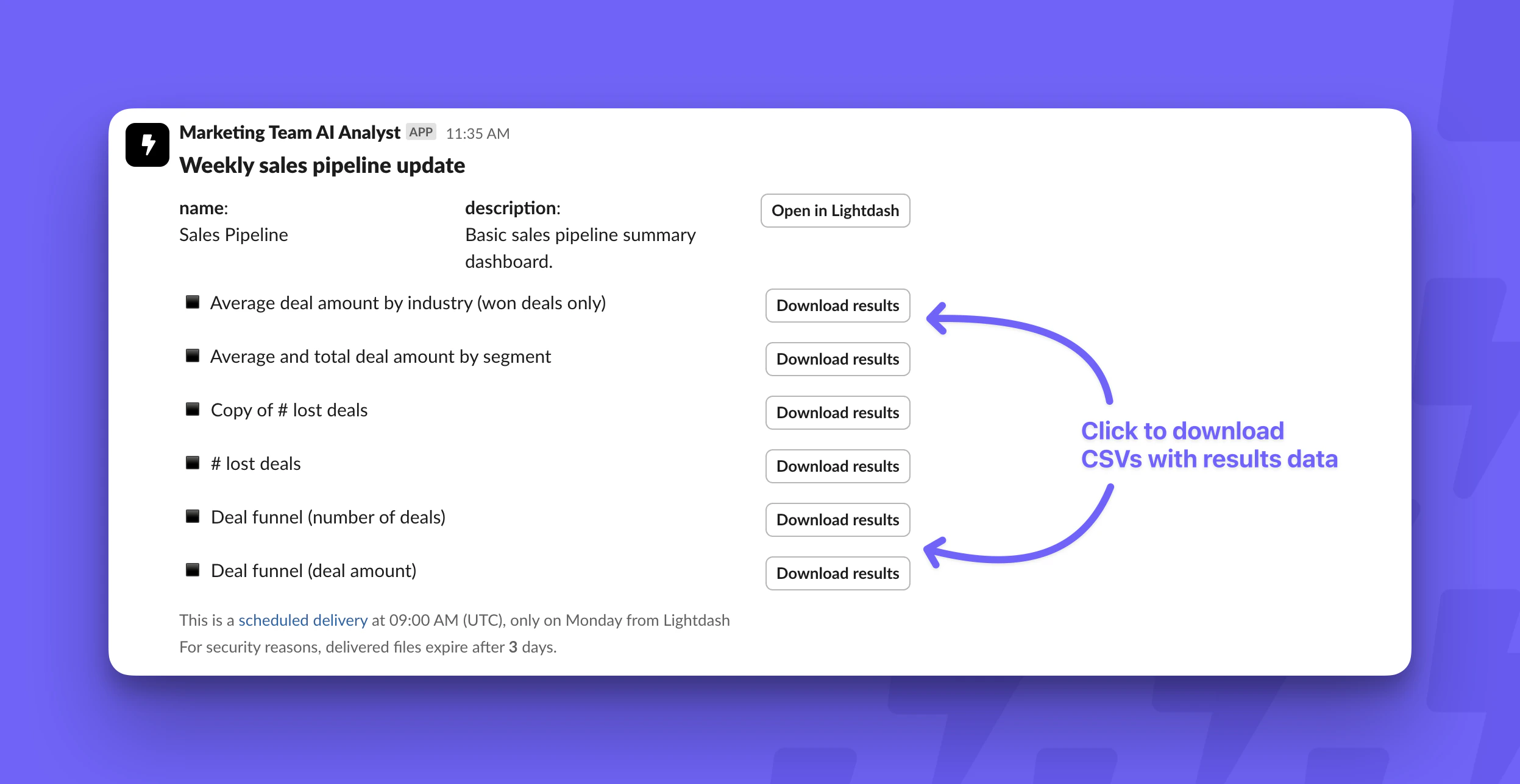 In addition to scheduled deliveries, you can also set up alerts on saved charts that only send to slack if certain criteria are met.
