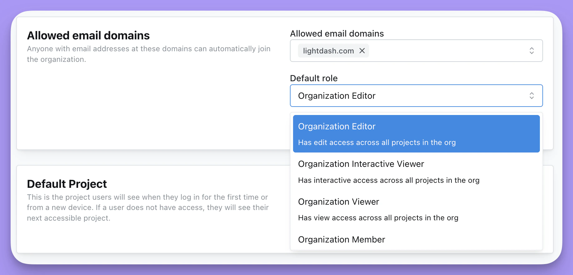 In the Allowed email domains panel, enter the email domain(s) you want to be able to automatically join your organization (e.g. here, we’ve added lightdash.com). Generic email domains like gmail.com or hotmail.com are not accepted. You can then select the access that you want these users to have by default. The organization Admin can always update a user’s permissions after they’ve joined!