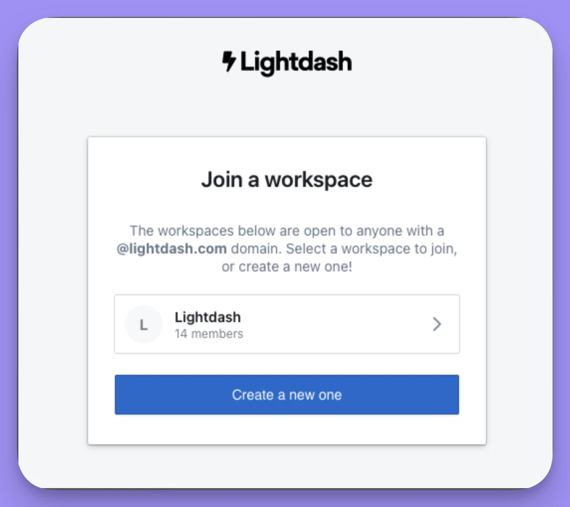 Now, when a user tries to join Lightdash, they will be prompted to join your workspace if they have one of your allowed email domains.