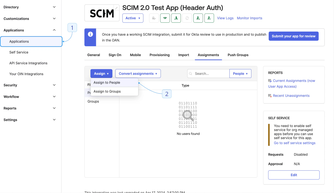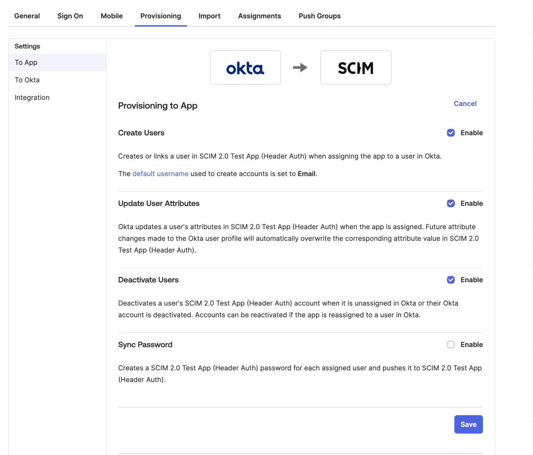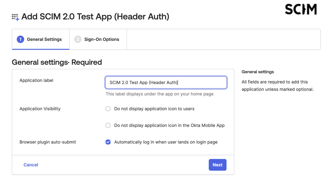 - Search for “SCIM” and select SCIM 2.0 Test App (Header Auth).