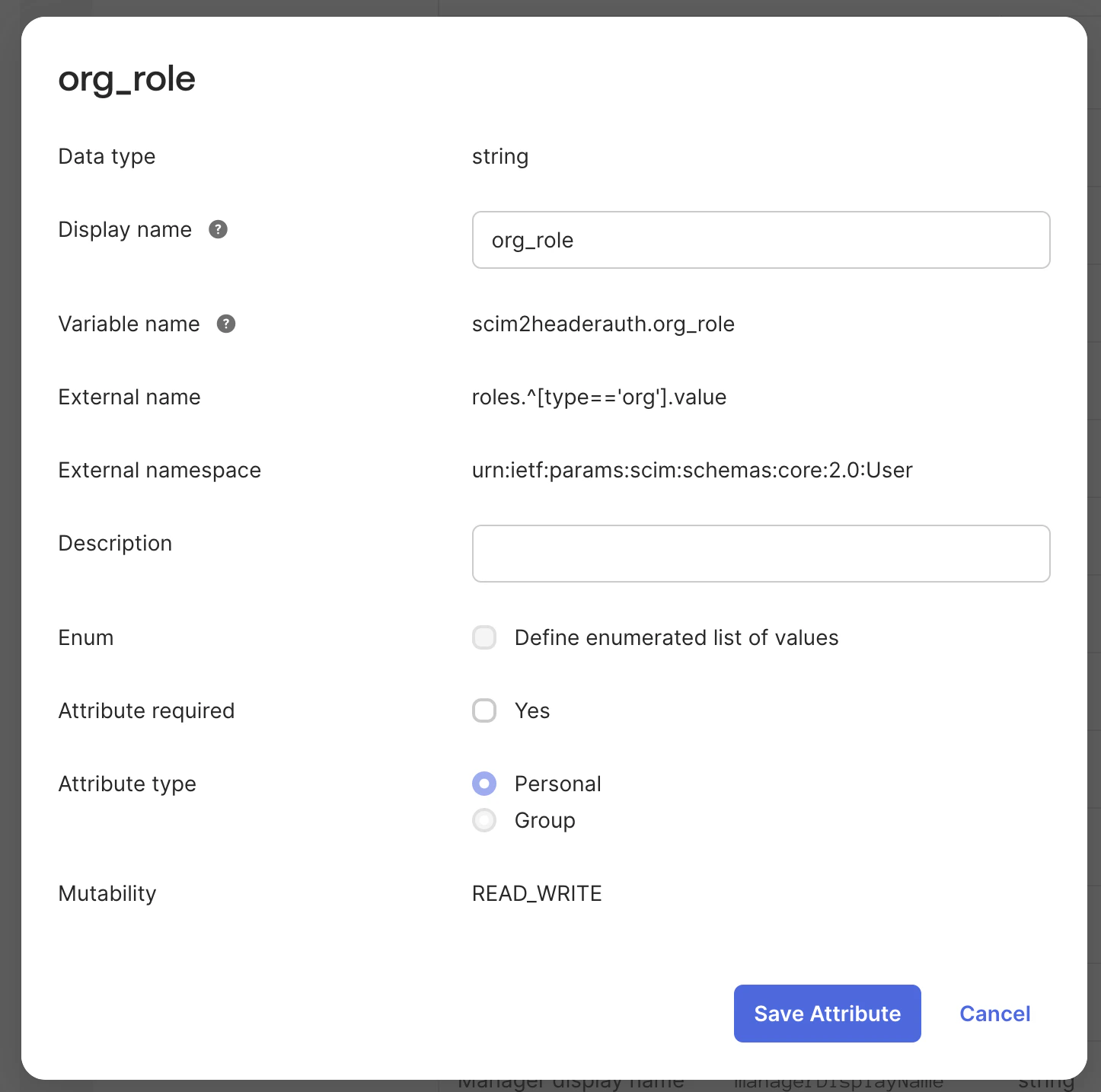 - Click Add attribute to create attributes for organization and project roles.